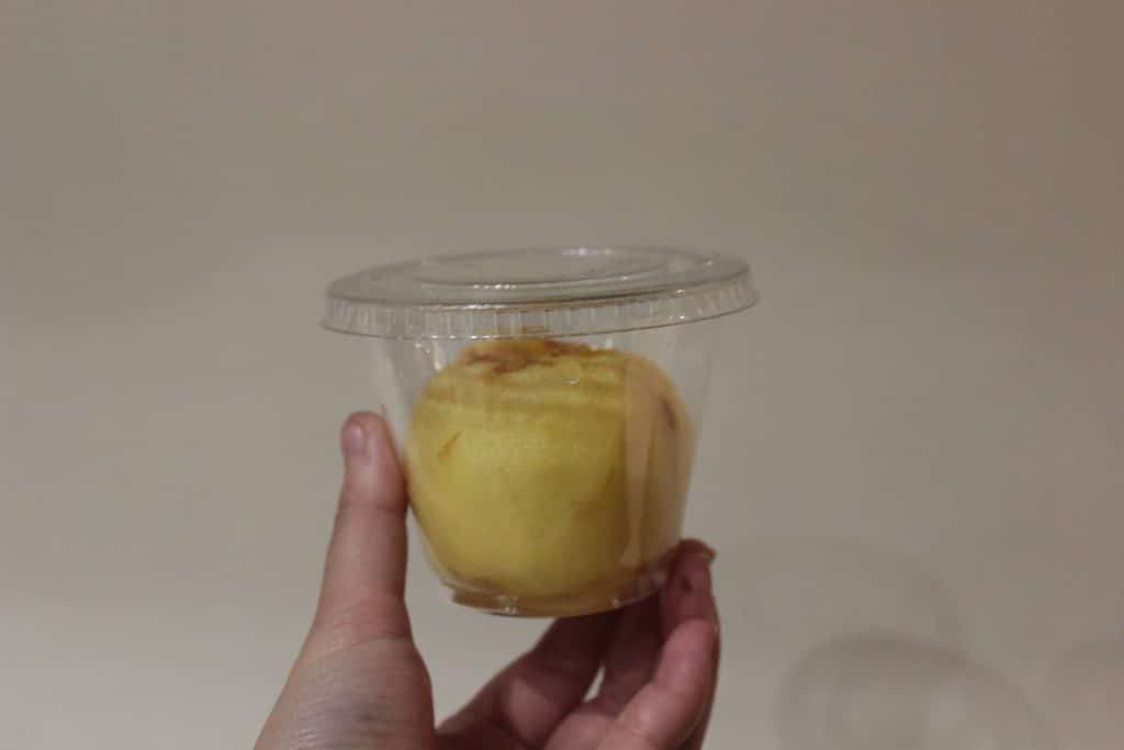 La pomme rôtie arrive froide mais peut se savourer chaude : sortez-la de sa boîte, posez-la sur une assiette, 30 secondes au micro-ondes et le tour est joué.