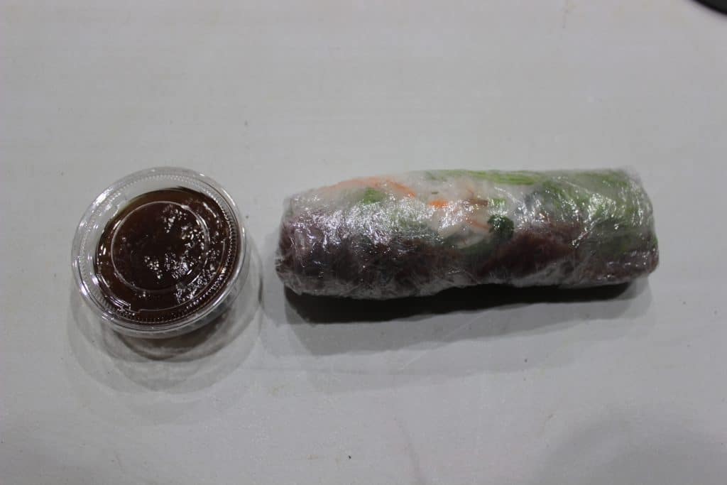 Le Banh Cuon s’accompagne de crudités et de sa sauce, dans une boîte en carton brun adaptée au micro-ondes.