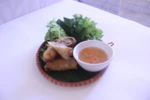 Nems maison : porc, crevettes, tofu végétarien, roulés et dorés avec soin.