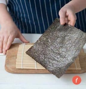 - Préparez votre espace de travail : un plan de travail propre, un bol d’eau additionnée d’un trait de vinaigre de riz, le makisu bien à plat, cordons vers vous. La feuille de nori se pose sur le tapis, côté brillant contre le bambou.